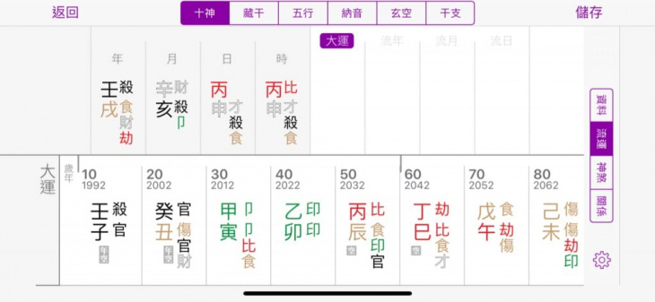 Đây là biểu đồ cần tăng cường Dương Hỏa (丙 火), vì vậy hai giai đoạn 10 năm đầu tiên chắc chắn được coi là tiêu cực vì Nước không đạt được điều đó.